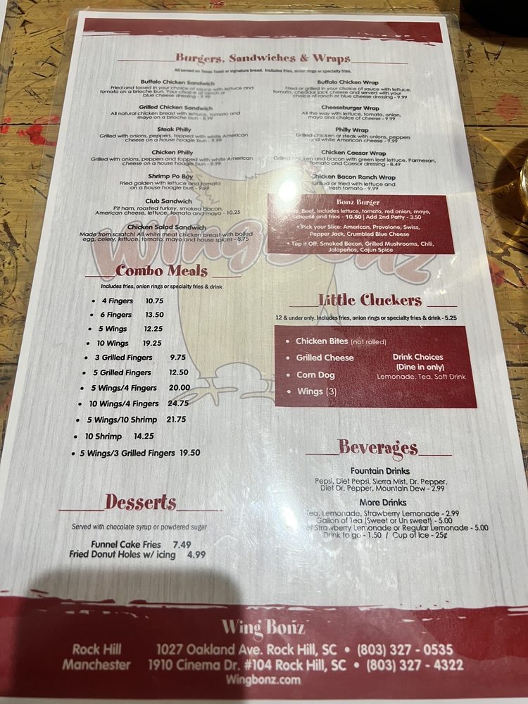 Introducing Wingbonz, a fast-food gem located at 1027 Oakland Ave Rock Hill, SC. They offer convenient delivery and takeout options, with ample private lot parking. The menu features enticing appetizers like Fried Pickle Spears and Fried Mushrooms. Sandwiches and wraps include the flavorful Buffalo Chicken Sandwich and the savory Philly Wrap. Don't miss out on The Legends section, featuring Grilled Jumbo Tenders and Finger Platters with a variety of sauces and dressings to choose from. The wide range of flavors and options at Wingbonz will leave your taste buds satisfied. Don't hesitate to try out this local favorite for a delicious fast-food experience with a twist.